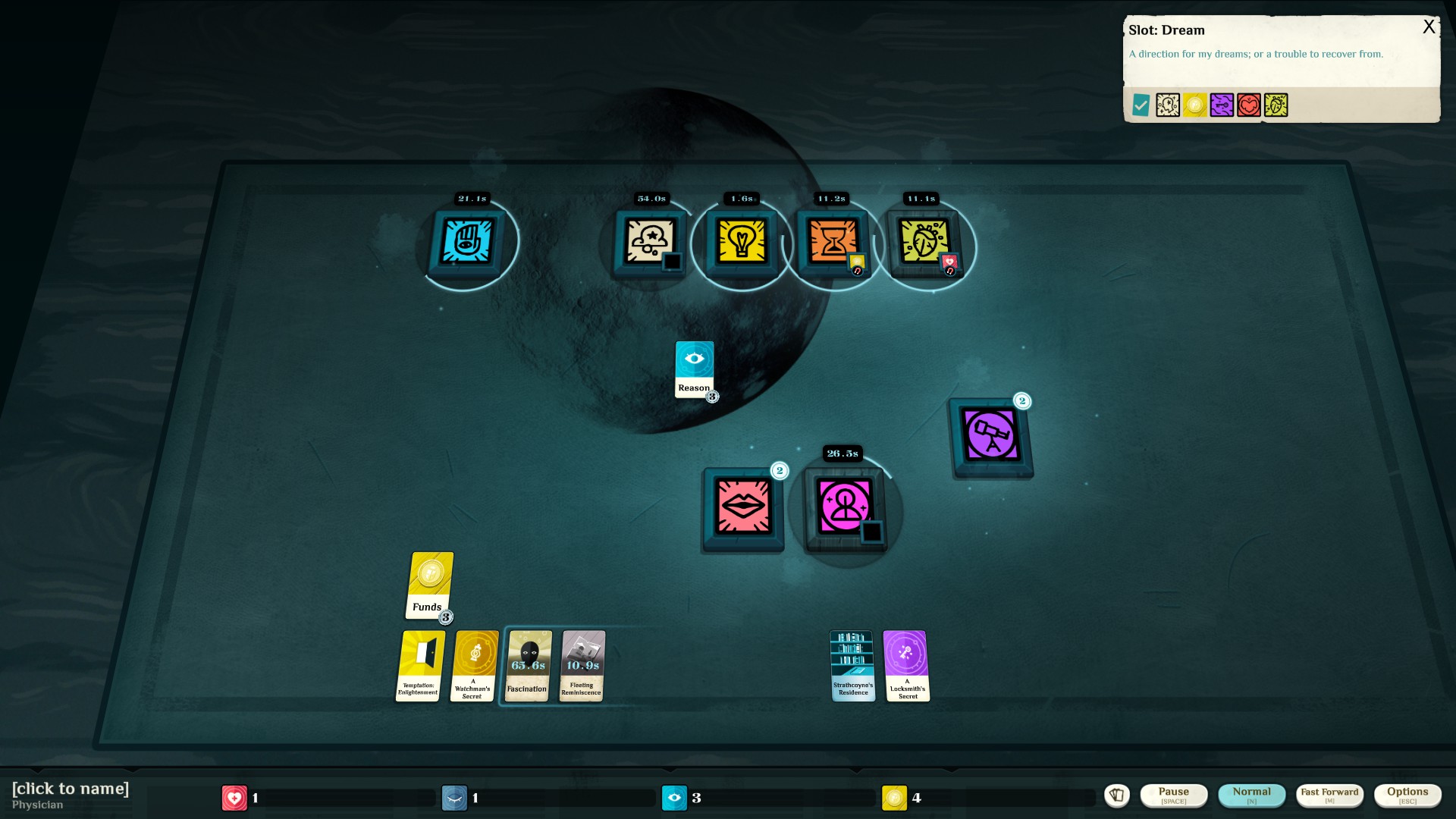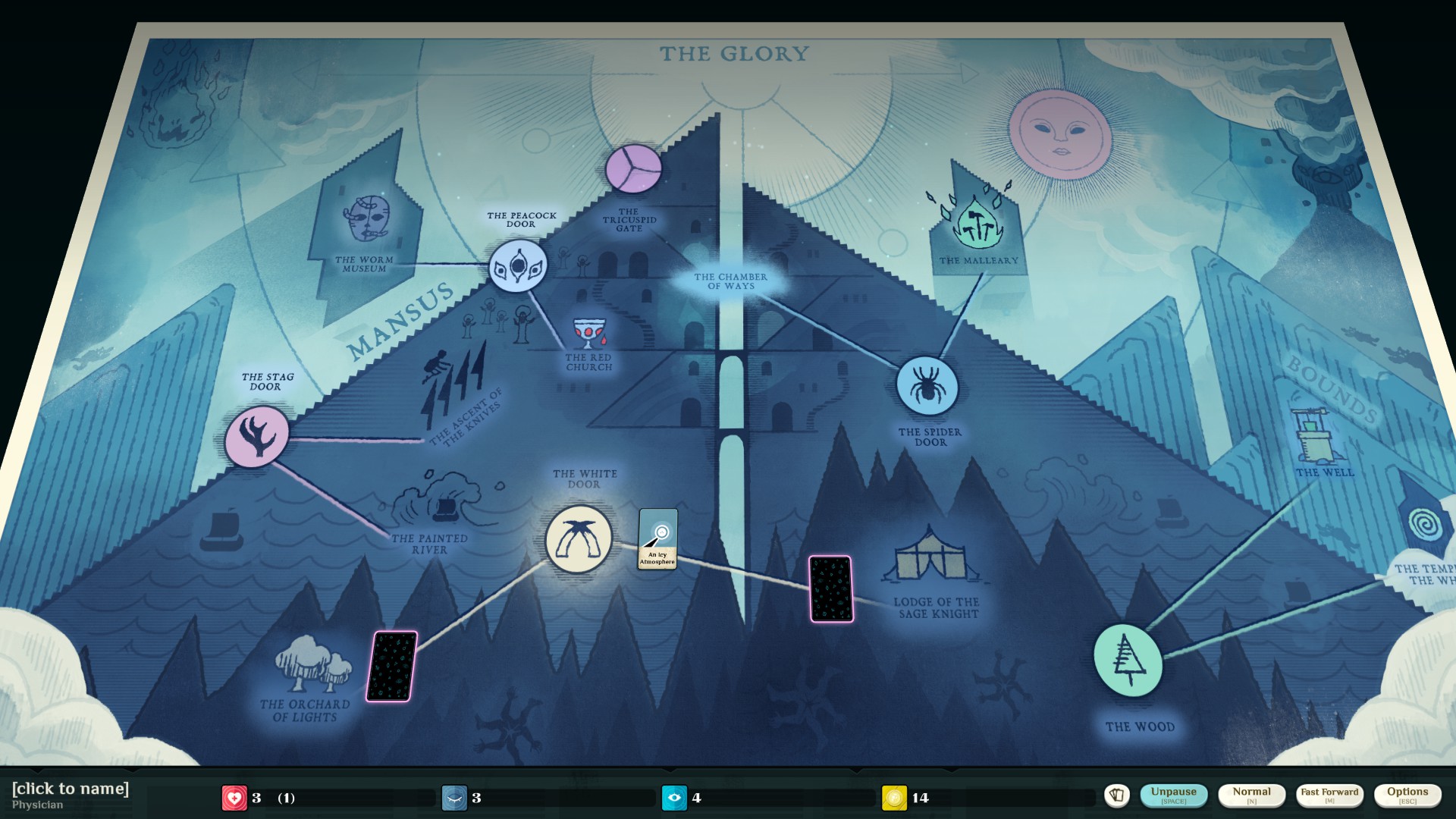The setting itself is also inspired by Lovecraft, but moreso his Dunsany-inspired Dream Cycle series than the usual more depressing Cthulu Mythos suspects. There’s a surreal fantasy impression to most of the lore you uncover, and the dream world of the Mansus could have been ripped straight out of the one of the Dream Cycle stories and I wouldn’t have been able to tell. The ‘hours’ are basically the deities of the Cultist Simulator setting, and seem like the pantheon of gods from a high fantasy setting than the alien abberations of Lovecraft’s works. The more I learned about the Mansus and the Hours, the more I found it weirdly reminiscent of Garth Nix’s YA fantasy series, The Keys to the Kingdom. Kudos to anyone who actually read that.