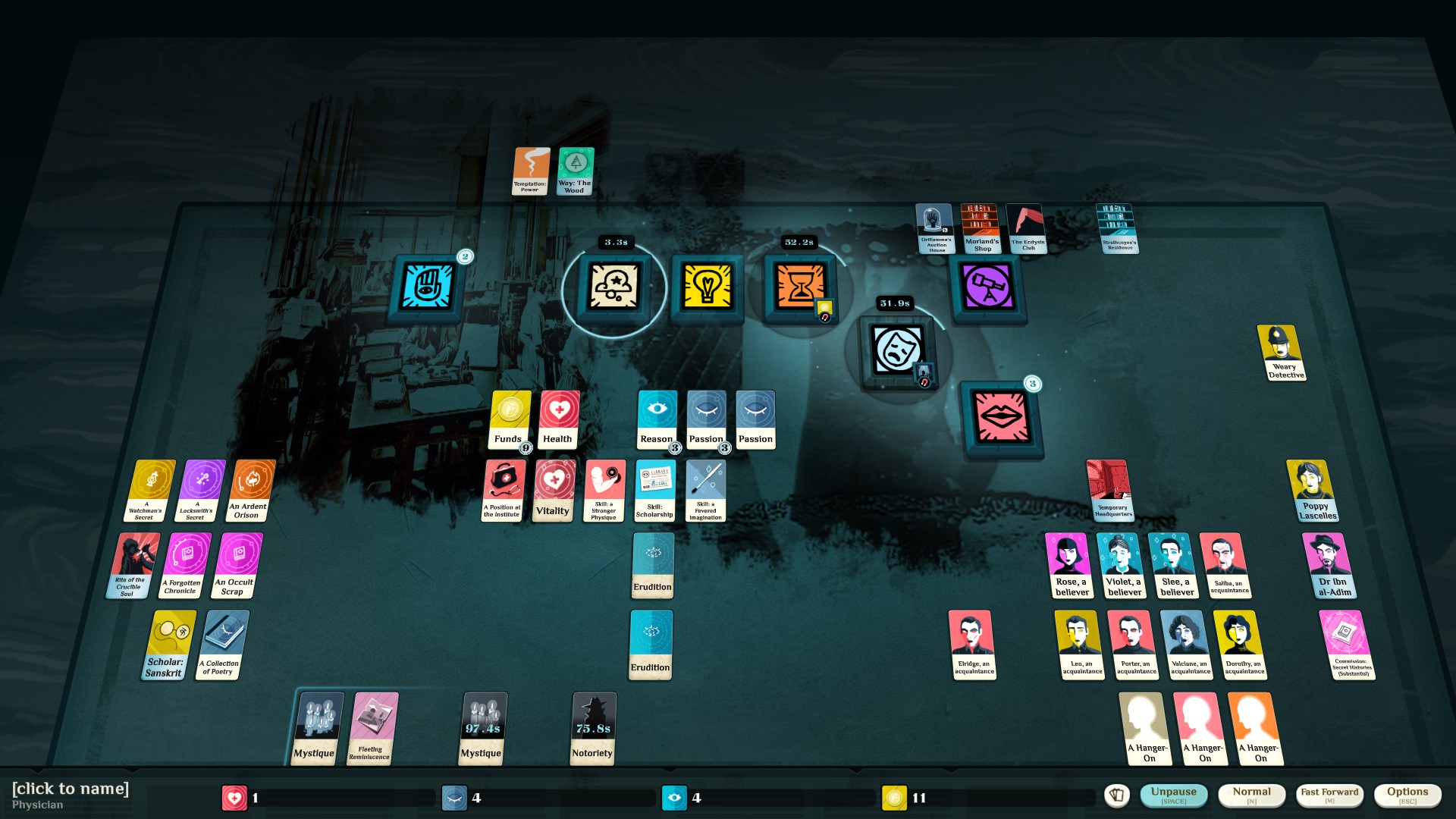 Your story begins simply enough: you work as a porter at a hospital and bond with an elderly patient. This patient soon passes away, leaving his belongings to you. Aside from a rather generous amount of funds, this includes some suspicious documents. Studying the documents piques your interest into the unknown by providing you with a scrap of lore from the ‘lantern’ aspect, which can be used to find your way to Dream World of the ‘Mansus’. From there you can find contacts which whom to found your cult and choose the founding principles (will you strive for power, enlightenment or something else?). From there, the game does a decent job at making you feel like a cult leader delving into the unknown as you translate antique books of obscure languages, trade this knowledge with interested patrons, and slowly piece the lore together into a deeper understanding of the complicated supernatural world that lurks beneath the surface of the game.